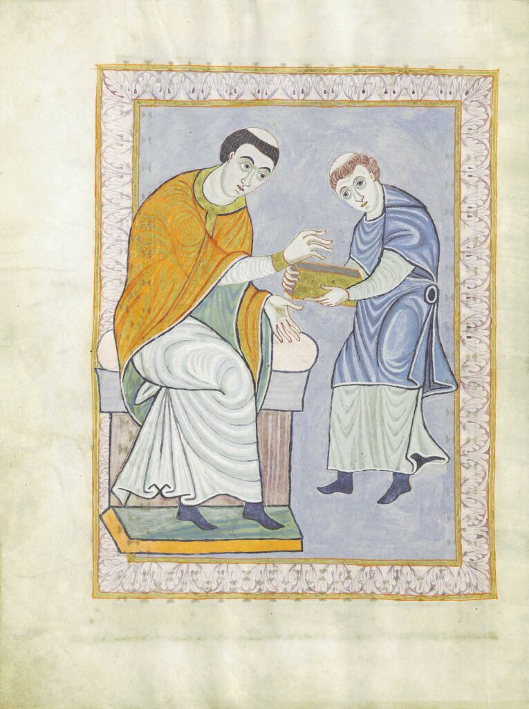 Gerone offre l’Evangelistario a San Pietro (6v): Gerone, vestito sobriamente ma con solennità, porge un prezioso libro ricoperto d’oro all’apostolo Pietro, raffigurato più grande e seduto su un cuscino rosso, con tunica rosa pallido e mantello celeste. Pietro benedice il dono con la mano destra e regge le chiavi con la sinistra, incarnando la Chiesa universale. La scena evidenzia la funzione di Gerone come mecenate e fondatore di monasteri benedettini.