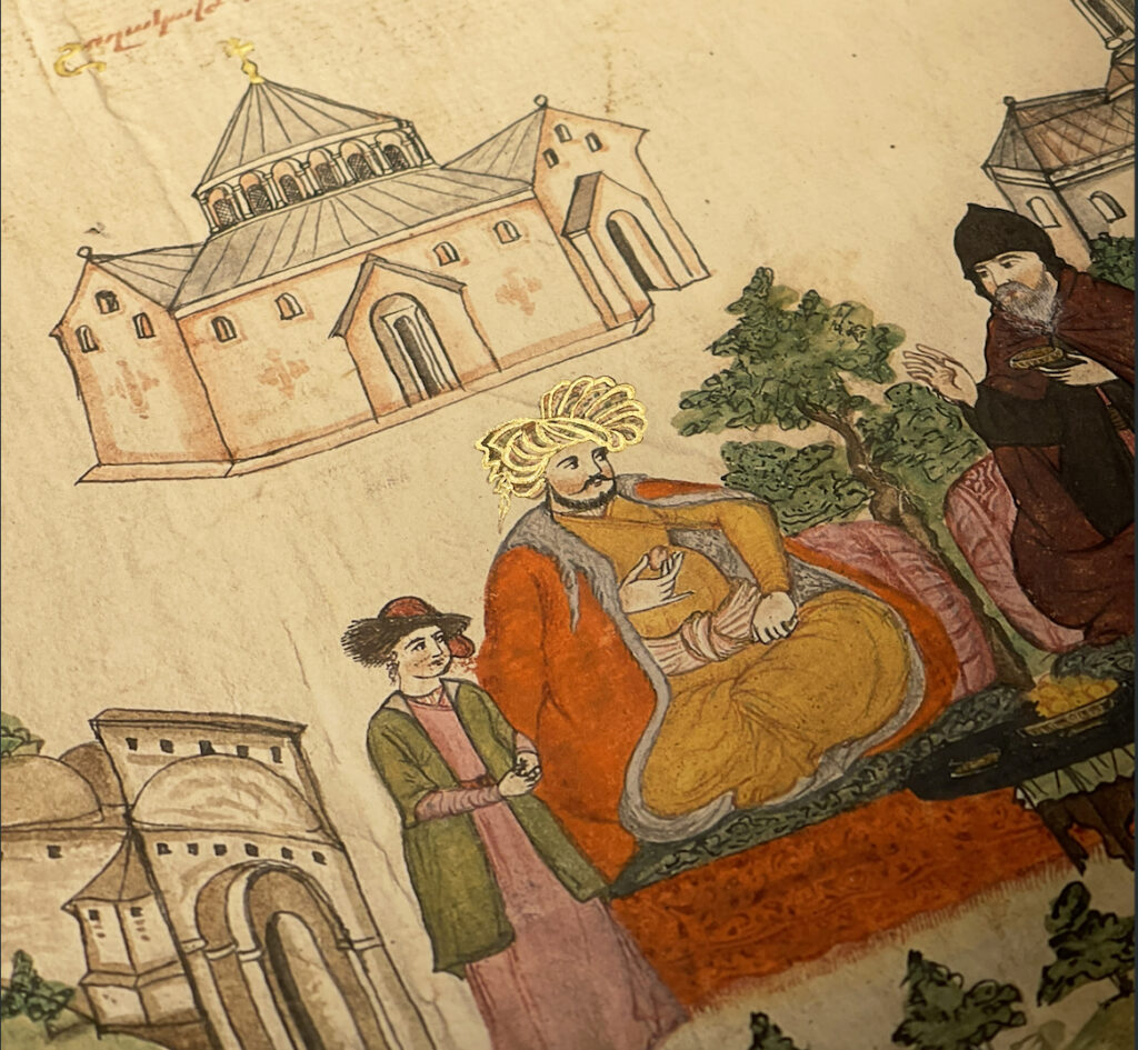 Realizzata su 16 fogli di carta incollati su tela, la mappa è interamente illustrata a mano con inchiostri e acquerelli policromi, risultando non solo un oggetto di rilevanza geografica, ma anche un manufatto di eccezionale pregio estetico. Le didascalie in lingua armena, numerose e minuziose, identificano numerosi siti religiosi, tra cui i principali centri ecclesiastici dell’epoca: i cattolicosati di Etchmiadzin, Gandzaar, Agh‘amar e Cilicia, nonché i patriarcati di Gerusalemme e Costantinopoli. Sono inoltre raffigurati luoghi sacri dell’Impero Ottomano, dalla Crimea a Nishapur, luogo del martirio di Lewondeank.